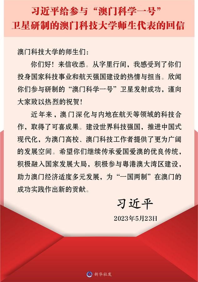 习近平总书记给参与“澳门科学一号”卫星研制的澳门科技大学师生代表的回信