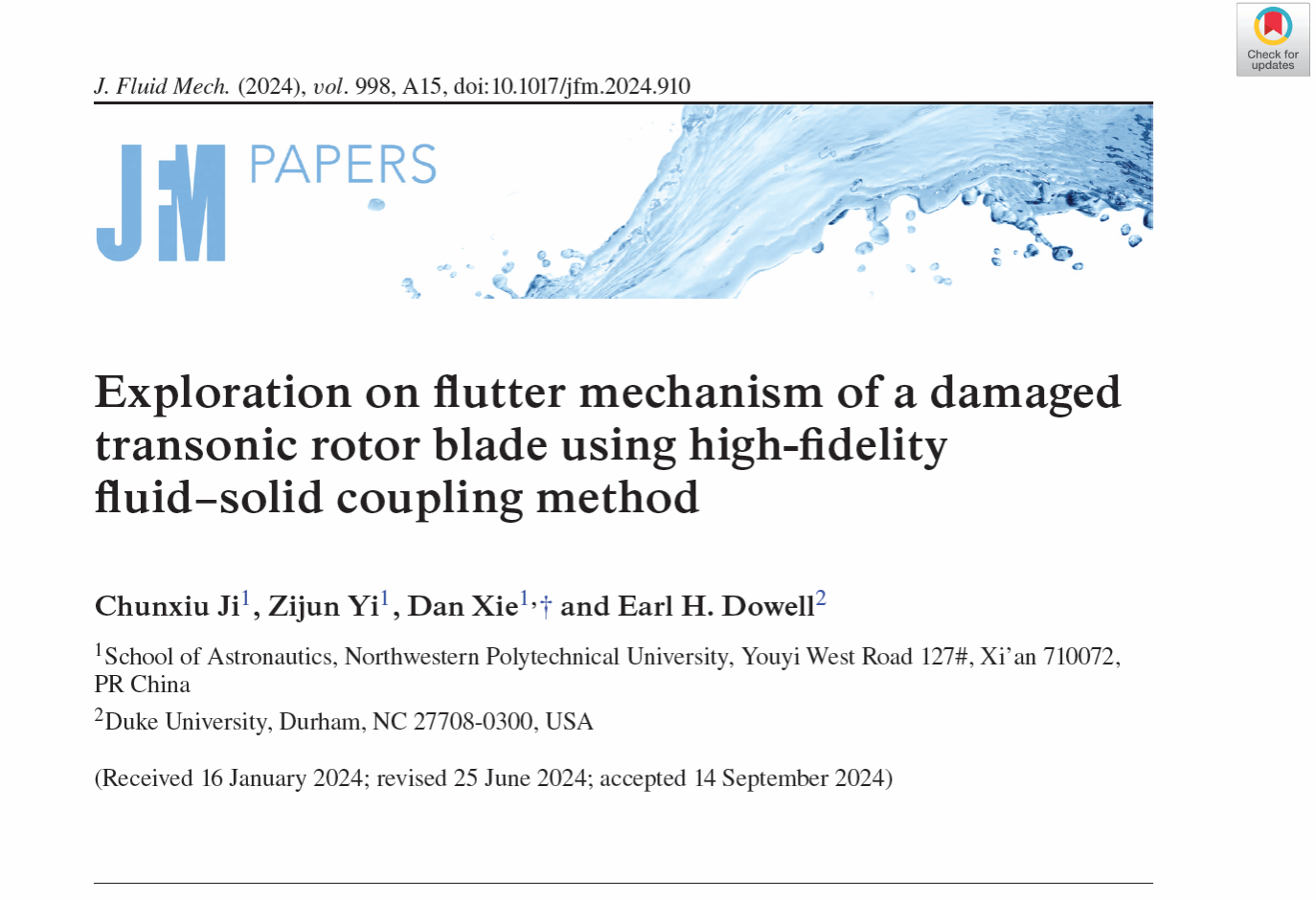 近日,TapTap谢丹教授团队在发动机转子损伤叶片颤振机理研究上取得重要进展。研究成果以“Exploration on flutter mechanism of a damaged transonic rotor blade using high-fidelity fluid–solid coupling method”为题发表在由英国剑桥大学George K. Batchelor创办的流体力学国际顶级期刊《Journal of Fluid Mechanics》上(https://doi.org/10.1017/jfm.2024.910)。谢丹教授是论文的唯一通讯作者,博士生冀春秀为第一作者,杜克大学Dowell教授为合作者。该研究得到了国家自然科学基金面上项目、国家自然科学基金国际(地区)合作交流项目资助。