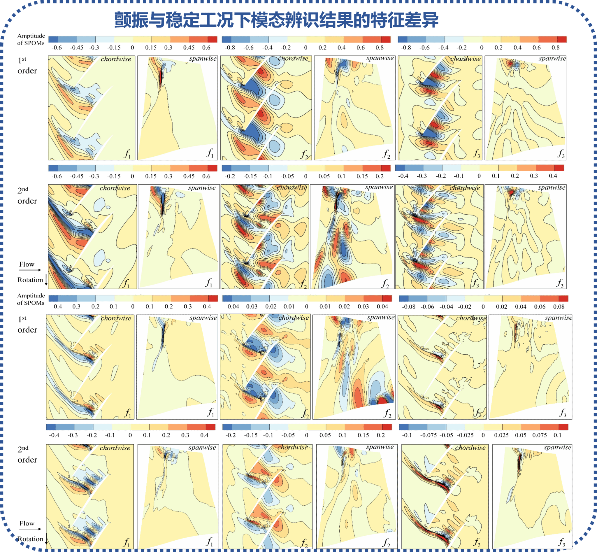 现代航空发动机“轻质量、高强度、高推重比”的高性能设计需求使得转子叶片的气动弹性效应愈加显著,且长时间的服役带来的疲劳损伤使得原本安全的叶片可能在工作工况下发生颤振,酿成严重飞行事故。为全面探究损伤叶片的颤振机理,谢丹教授团队首次考虑叶片的结构损伤,通过建立高精度的静/动气动弹性耦合系统,揭示了叶片在损伤工况下发生气弹失稳的发生机理。针对非定常流场,采用谱正交分解法(SPOD)辨识关键模态,发现大尺度高频扰动是叶片发生颤振的主要诱因。这一研究为高性能叶片结构设计和颤振主动抑制提供了重要的科学依据。