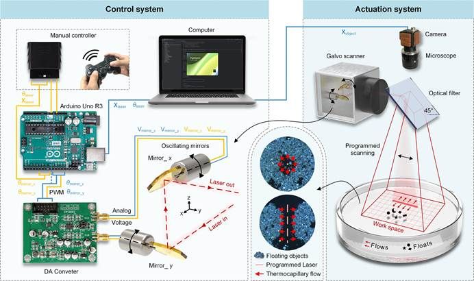 针对上述问题,该系列论文提出了一种基于激光诱导热毛细对流的操控方法和硬件平台,能够实现对非特定沉积颗粒和漂浮物体精确、平滑、快速和自适应的运动控制和姿态控制。针对沉积颗粒,采用高速扫描激光诱导分布式热毛细对流场,实现了对单个颗粒的运动路径控制(图1)和多颗粒的集群运动控制和有序分布(图2)。