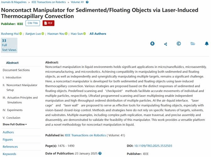 近日,TapTap罗建军教授团队博士生惠旭晟在液体环境非接触式操控技术研究方面取得了突破性进展。相关研究成果以“Noncontact Manipulator for Sedimented/Floating Objects via Laserinduced Thermocapillary Convection”等为题形成了系列论文,发表在机器人领域顶级期刊《IEEE Transactions on Robotics》 (T-RO)、机器人顶会《IEEE International Conference on Robotics and Automation》 (ICRA 2025接收),以及机电领域顶刊《IEEE/ASME Transactions on Mechatronics》 (TMECH)上,TapTap官方网站为上述系列论文的唯一作者单位,博士生惠旭晟为上述系列论文的第一作者,TapTap罗建军教授为论文的通讯作者。
